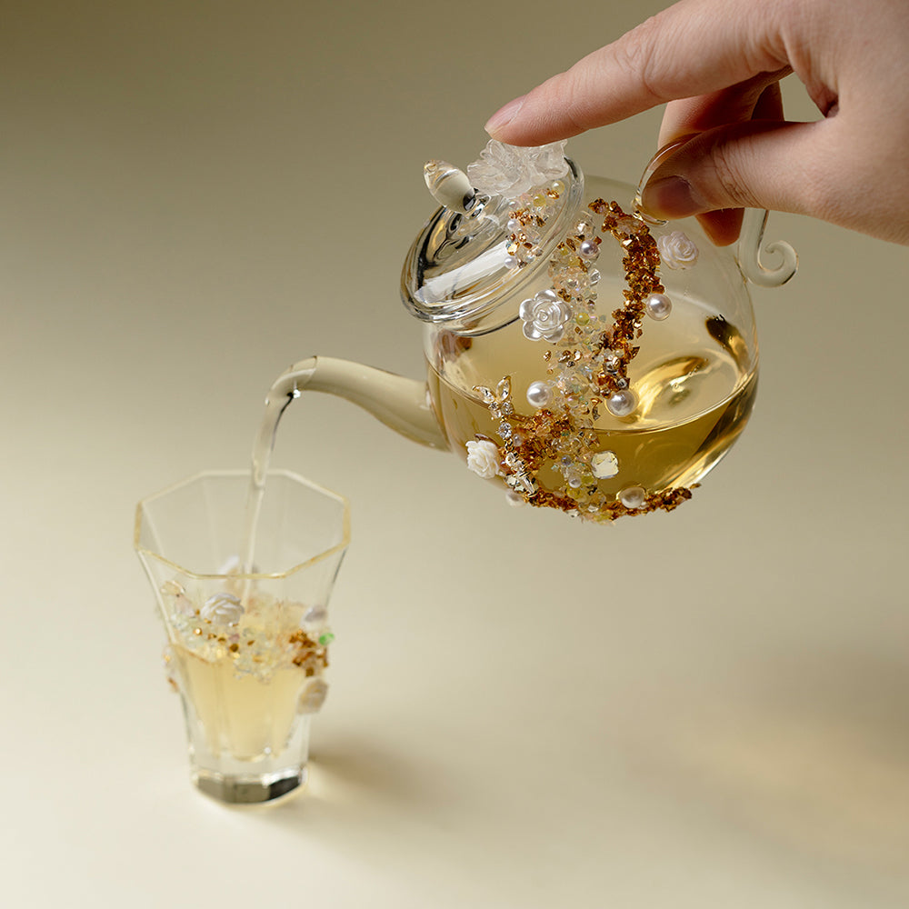 مصنوع من زجاج البورسليكات المتين المقاوم للحرارة، يمزج هذا الإبريق الجميل بين الفن الرائع والتصميم العملي. التصميم مستوحى من جمال غيوم الغروب والورود البيضاء، حيث تحيط اللآلئ وزهور الكريستال بالإبريق بأناقة، والزجاج نقي كالكريستال، وعندما يُسكب الشاي في الإبريق، يشبه اللون الكهرماني ألوان السماء الدافئة في المساء، مما يخلق تأثيرًا جميلاً. هذا الإبريق الزجاجي سيتناسب تمامًا مع أي نمط ديكور منزلي وسيُظهر ذوقك الأنيق سواء أثناء الاستخدام أو العرض.