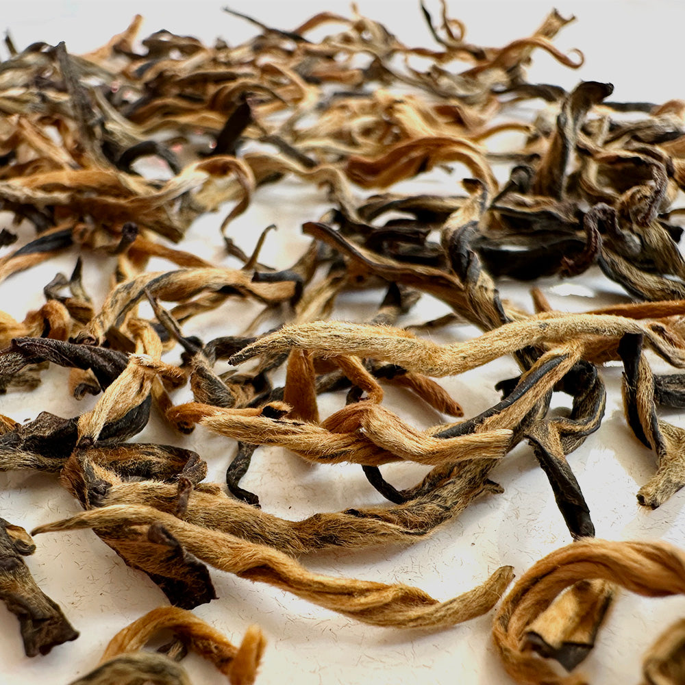 This fascinating black tea is made from the Ying Hong #9 cultivar with a honey-floral aroma and hints of maple syrup sweetness. The texture is creamy and velvety without any astringency. The aftertaste is enduring and malty sweet.