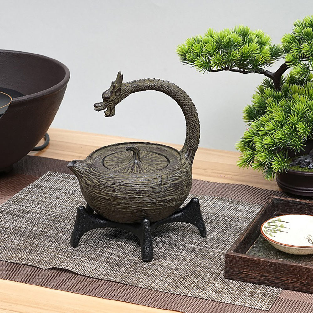 This Japanese cast iron teapot is made of solid pig iron, it carries a sense of quiet strength and timeless beauty. The teapot has a dragon handle, which is majestic and domineering, symbolizing strength, wisdom and good luck. Its surface emulating the flowing grain of wood, showcasing the beauty of nature and the excellent of traditional craftsmanship. The sturdy cast iron has good heat retention, which can keep the water warm for a long time and enhance the taste of the tea aroma.