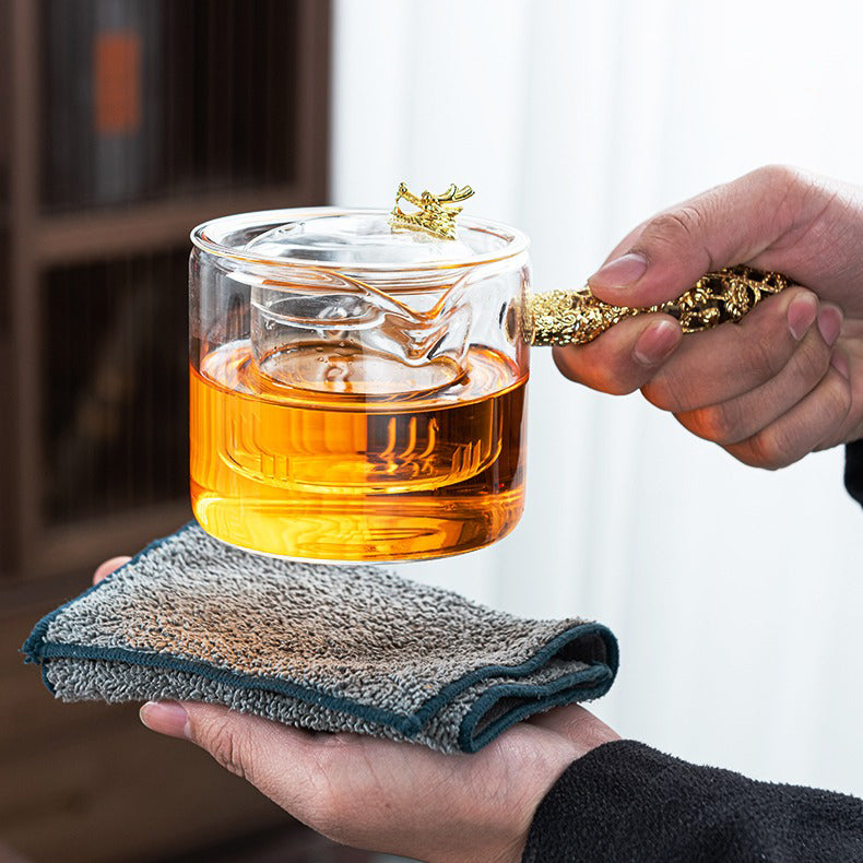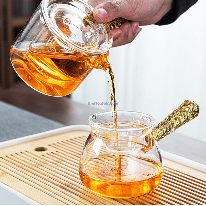 This clear glass tea set is perfectly made for tea drinking. It is a distinctive tea set which is characterized in the unique and novelty design. This Glass Tea Set With Golden Handle is unique in design, superior in quality and easy in maintenance. It is not only exquisite and durable, but also moderate in price and suitable for you to buy. As the material is glass, you can clearly watch the beautiful tea leaves or flowers dancing in the teapot. The delicate design will drive you to a quiet and joyful tea drinking atmosphere. If you want to appreciate the beauty of the tea leaves dancing in the teapot while sipping the palatable tea, take it, and take time to enjoy your beautiful life.