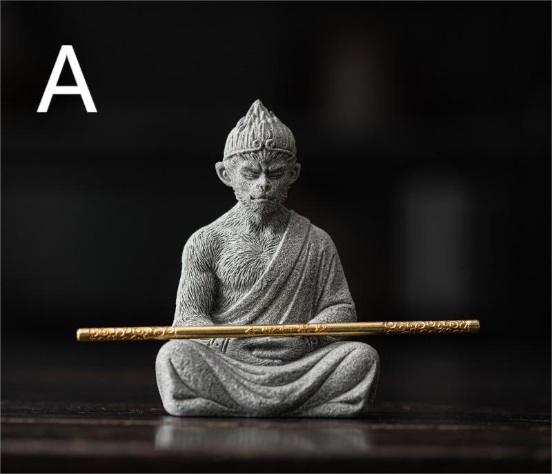 The material of this Wukong tea pet is blue sandstone, also known as environmentally friendly stone. It is a loose mixture of sand and gravel. The products made of it are beautiful, calm and restrained. The tea pet has been meticulously carved by craftsmen, its lines and contours are clear, and each texture is unique. The golden hoop stick is detachable and fun to play with. Its shape is lifelike, whether it is placed on the table or as a tea room decoration, it can add a sense of fun and vitality to the space. It combines Zen and tea ceremony, perfectly interprets Chinese aesthetics, and expresses a casual, leisurely and free-spirited mentality.