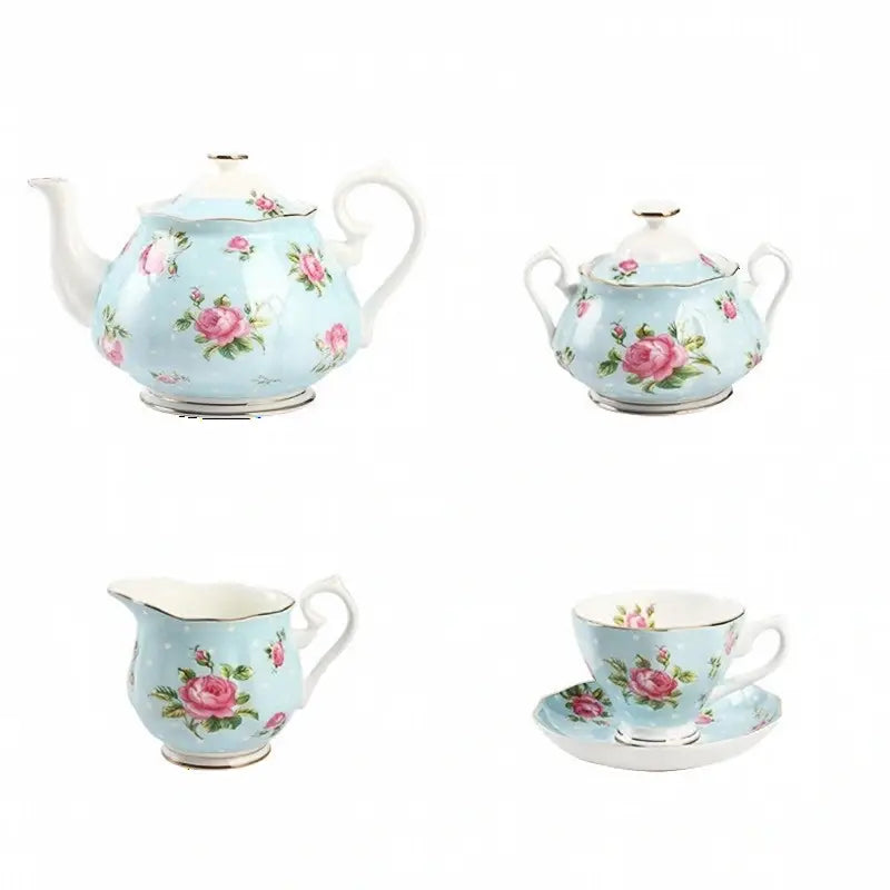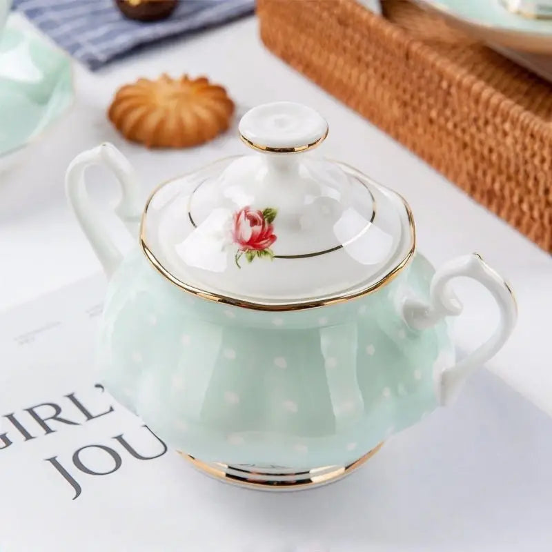The Light Green Dotted Bone China Tea Set is made of bone china containing more than 40% bovine bone powder. The bone powder ceramics fired at high temperature are dense, non absorbent, stronger and have a longer using period. In terms of patterns, the high-temperature baking process is used in the painting of tea sets, which makes the patterns not dissipate, not easy to change color and oxidize, and more beautiful and lasting. The bone china is delicate in texture, transparent, light and convenient to use. The teapot spout was designed many times, and finally chose the eagle beak style. The teapot and teacup have unique handle design, which makes the appliance easier to grasp and more stable to grasp. The sugar pot adopts a double ear handle design, which makes it more stable and firm to take, greatly reducing the possibility of damage caused by weak grasp, and making it more safe to use.