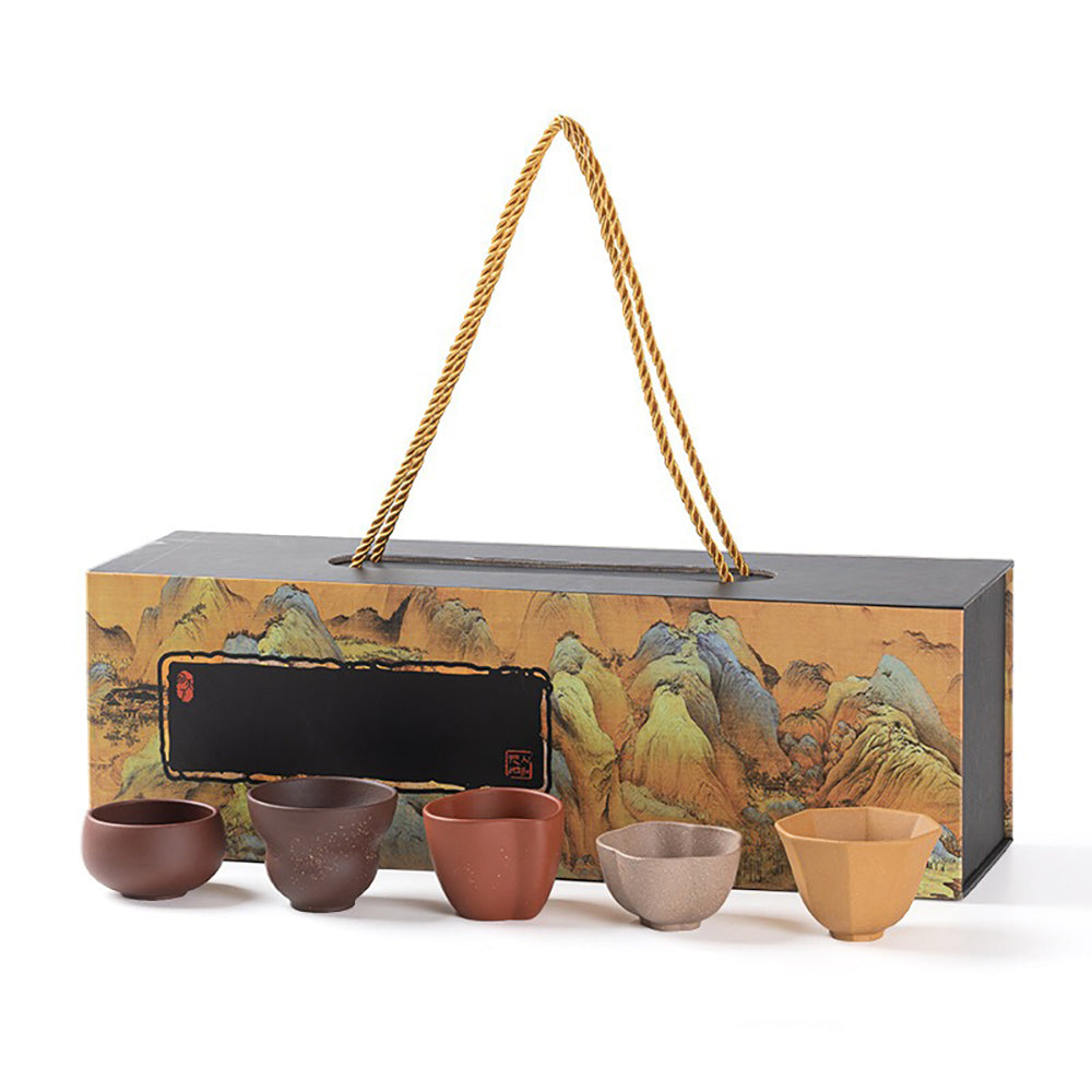 This five-piece tea cup set is handcrafted from authentic Yixing clay, each cup is made of clay of a different color. They are in five different shapes - lucky bag, gourd, peach, plum blossom and octagonal cup - represent the five auspicious wishes of happiness, prosperity, longevity, joy and wealth. This set of purple clay cups showcases a rustic, natural beauty, designed to enhance the elegance of the traditional Kung Fu tea ceremony.