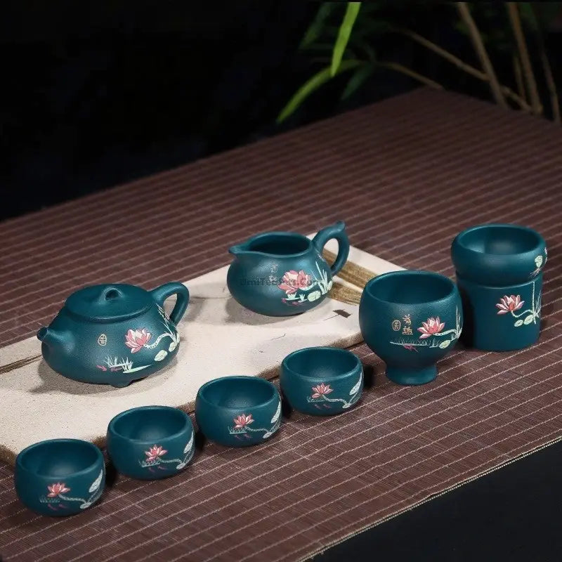 The Yixing Blue Clay Lotus Shi Piao Tea Set is made by firing high-grade raw mineral clay at 1300 ℃. Zen carving, the bottom is polished smooth and placed smoothly, and the lotus pattern design is fresh, elegant and poetic. The handle is designed refers to ergonomics, which is comfortable to hold, convenient and labor-saving. Round spout design makes the tea-pouring is smoothly, not easy to splash and leak, and it is clean and tidy when you use it. The edges of the fair cup are designed to pour tea intensively and neatly. The edges of the tea set is carefully polished, the mouth of the teacup is round and qualitative, the bottom is smooth and flat.