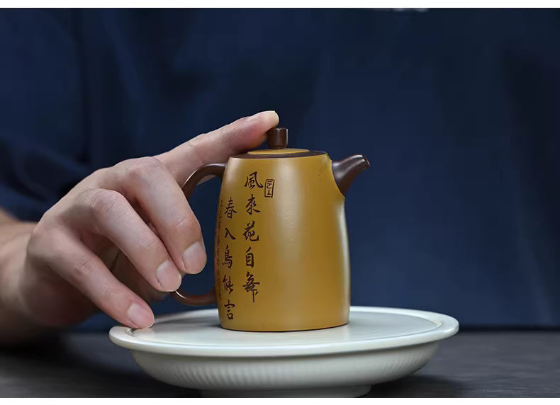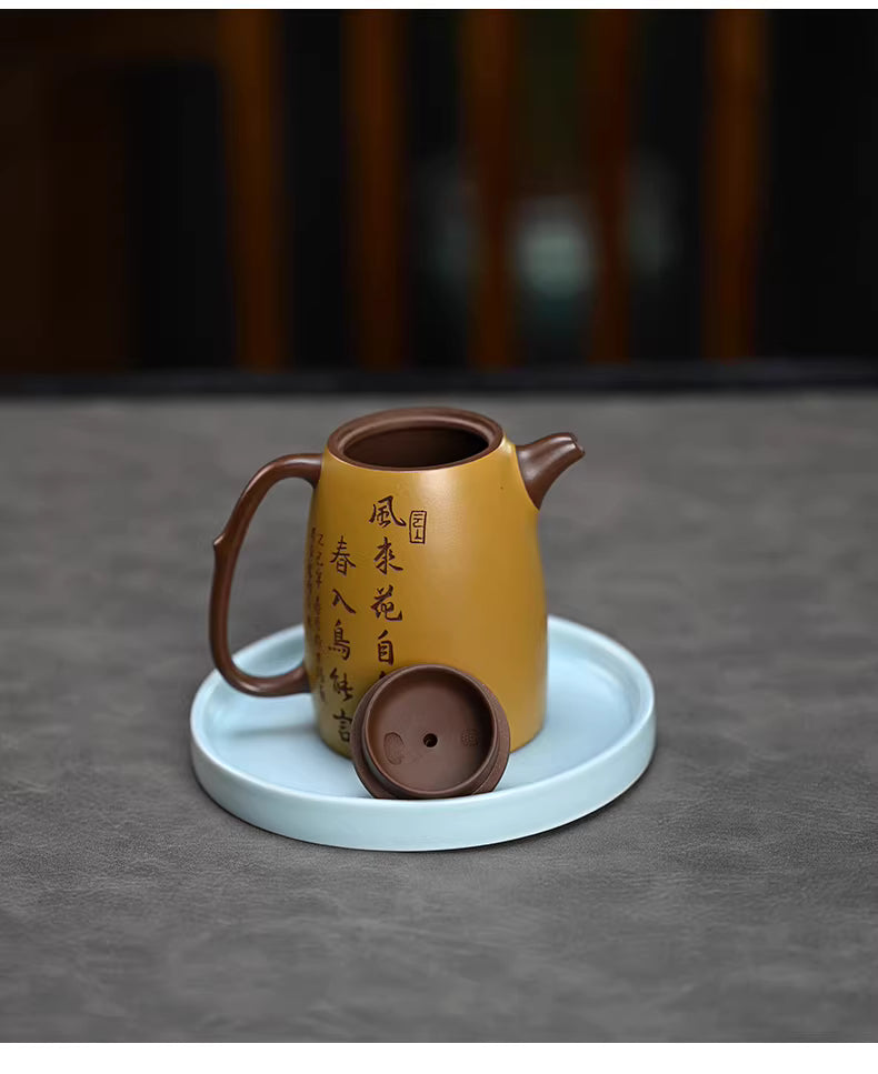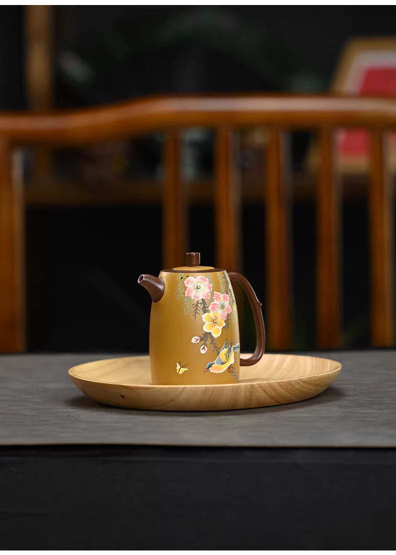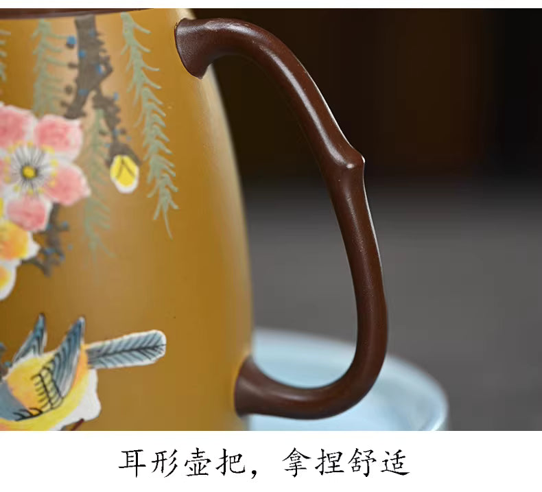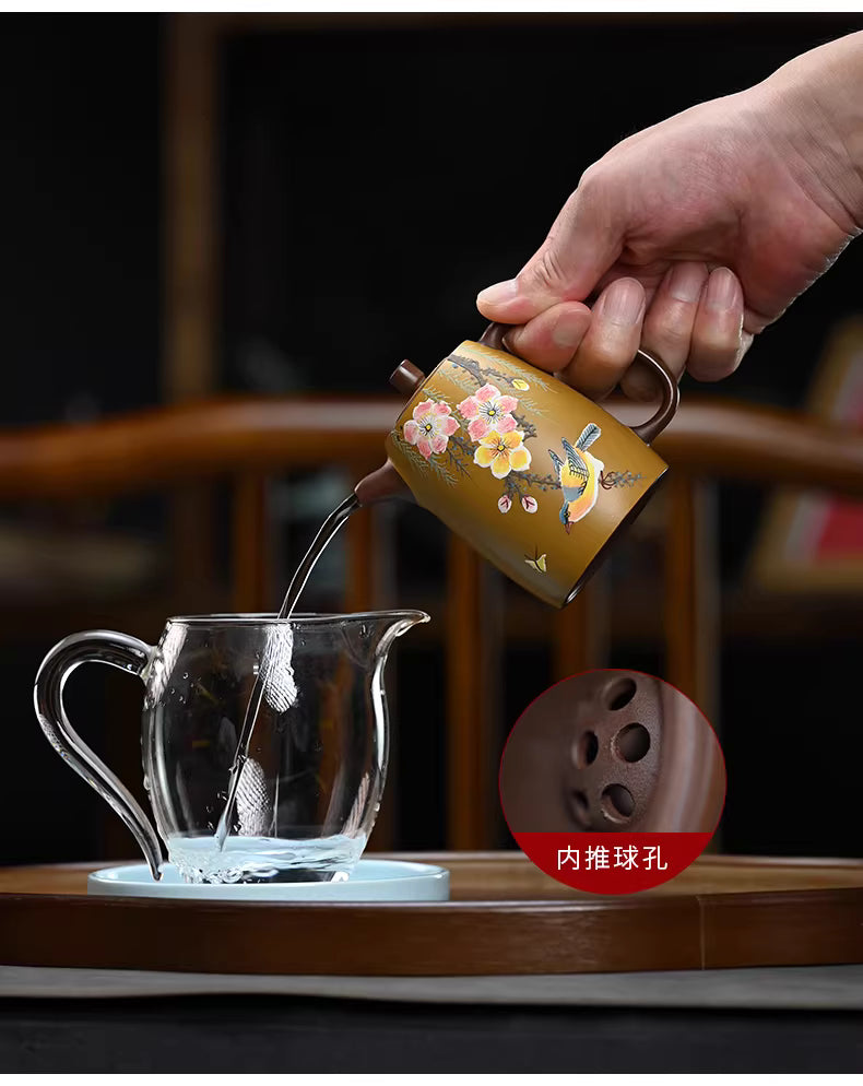 The body of the teapot serves as a canvas for a stunning "Fen Jiang" (粉浆) mud-painting, featuring vibrant blossoms and a songbird in a style that mimics traditional Chinese ink wash paintings. On the reverse, elegant calligraphy captures the essence of spring, making every tea session a meditative experience.