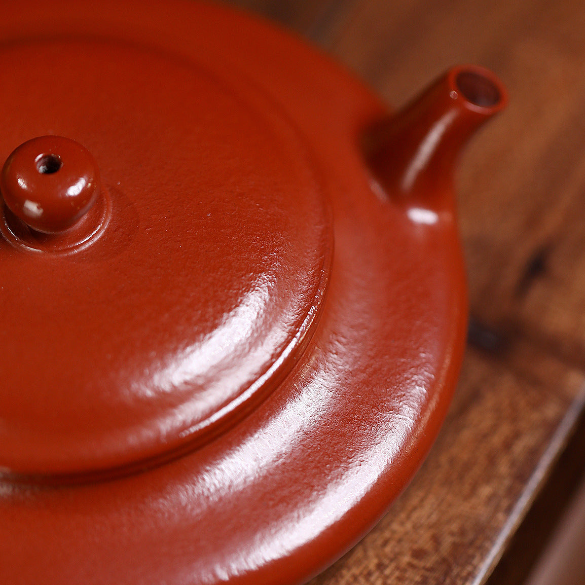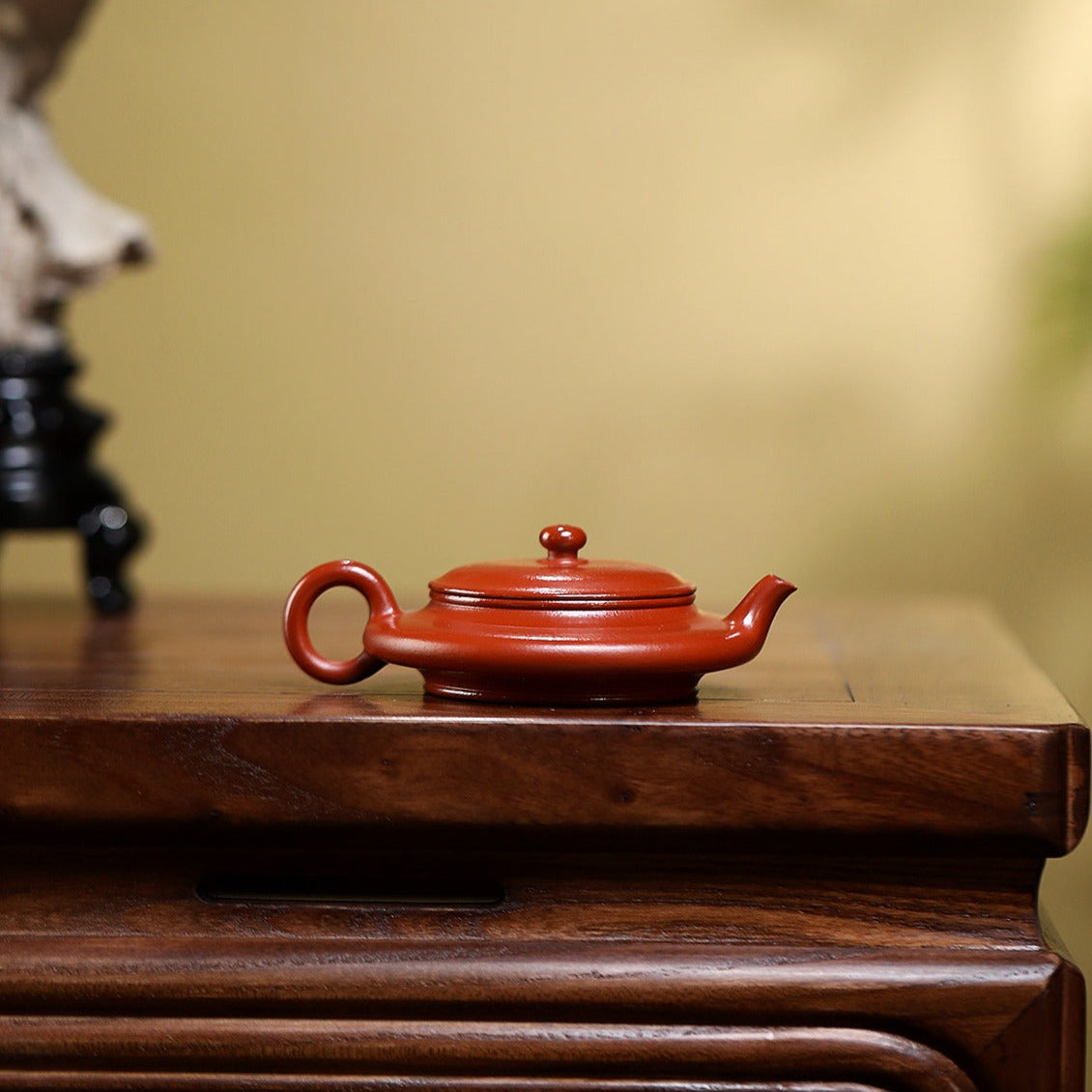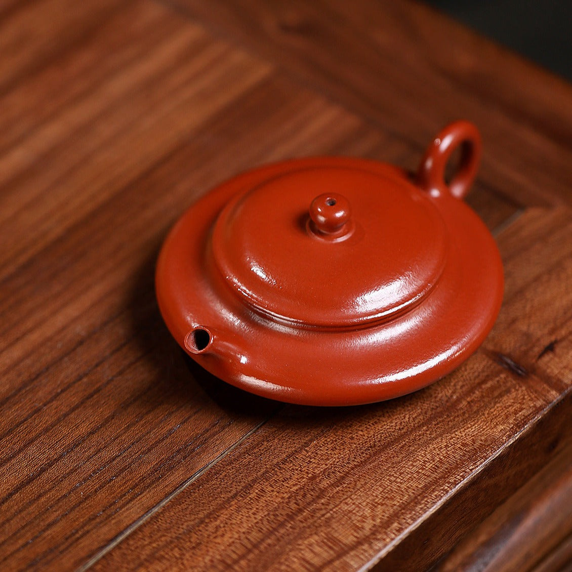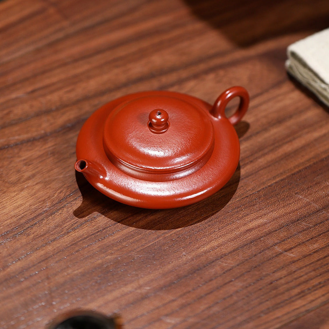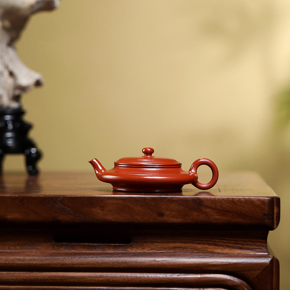 This handcrafted Flat Teapot showcases the refined artistry of Yixing clay craftsmanship. The smooth, flowing lines unite the handle, spout, and body in a seamless, lifelike design, giving the teapot both elegance and presence. Made from wrinkled cinnabar clay, its subtle color and natural lustre deepen over time, revealing a gentle, dignified patina with prolonged use.