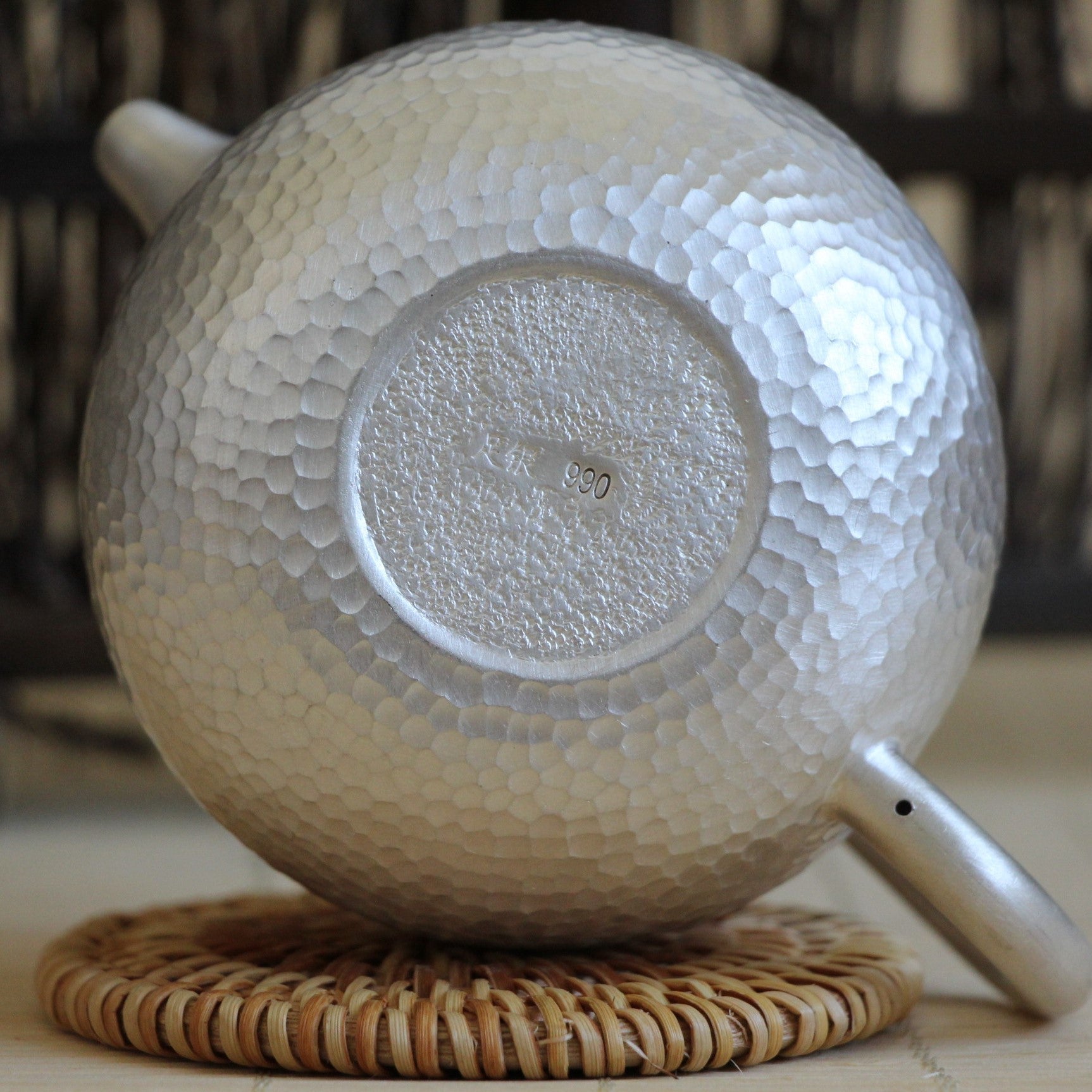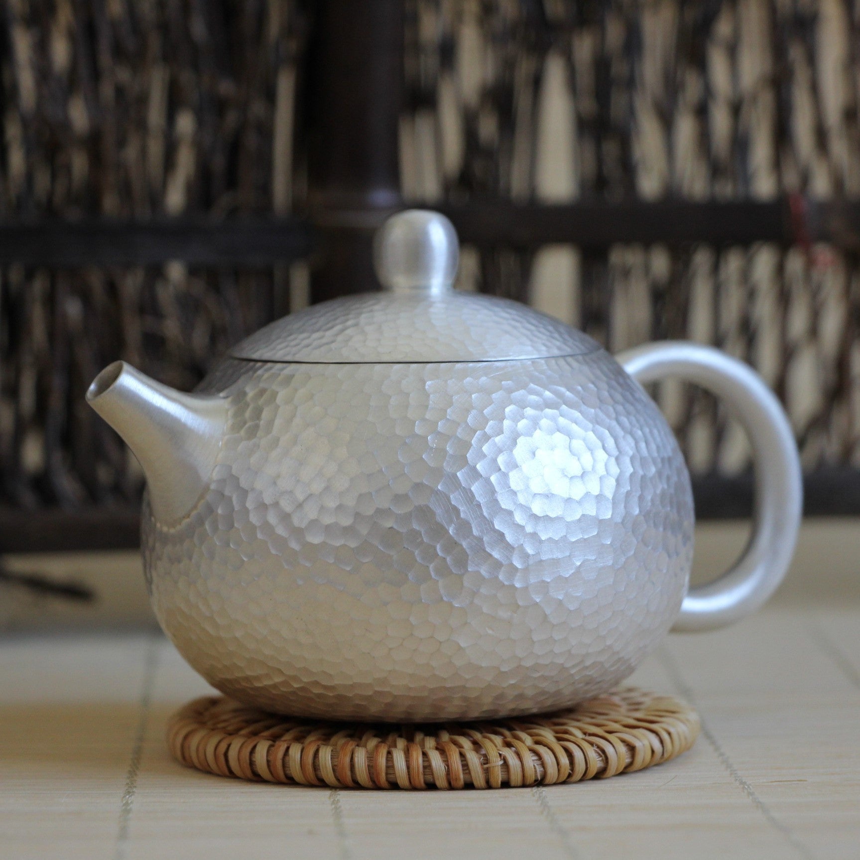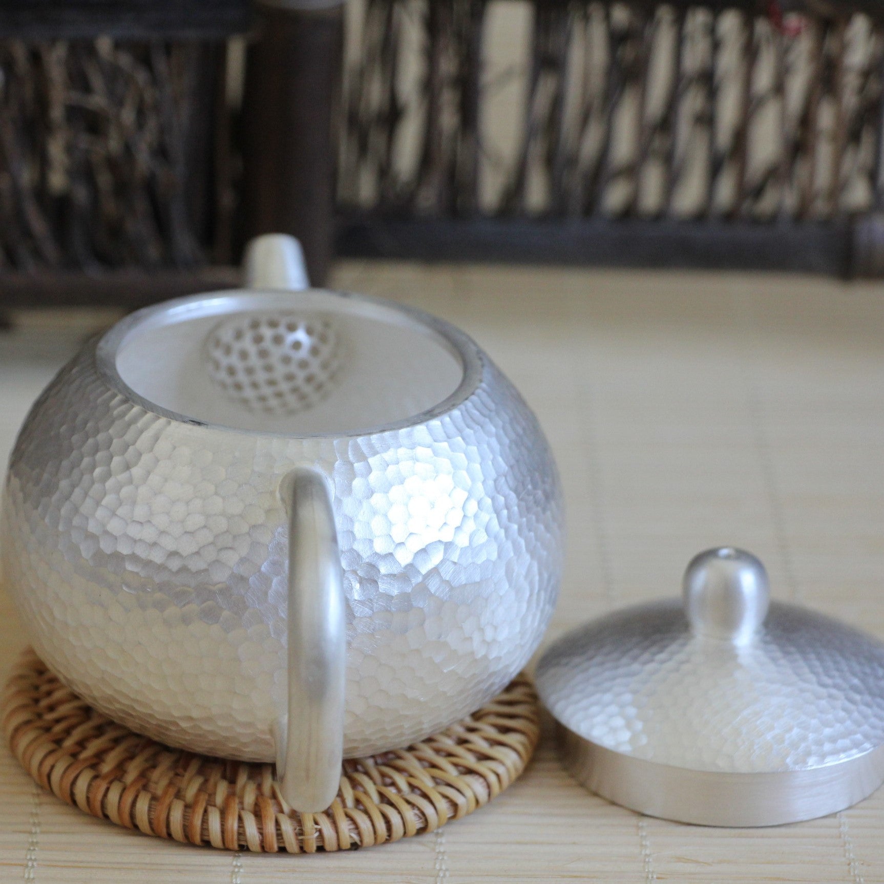 Reine Silber .999 Teekanne für Gong Fu Tee-Zubereitung. Fachmännisch gefertigt in Yunnan (Kreis Qujing) vereint diese reine Silberteekanne Funktion und Schönheit mit elegantem Flair. Hergestellt von den erfahrensten Silberschmieden Yunnans im Kreis Qujing (einem Ort mit über 1500 Jahren Geschichte in der Herstellung feiner Silberobjekte), wird diese Teekanne Ihr Gong Fu Cha Tee-Erlebnis perfektionieren! Es wird angenommen, dass Silber das beste Medium ist, damit Wasser und Tee aufeinandertreffen. Dies ist .999 Silber, was bedeutet, dass es zu 99,9 Prozent aus Silber besteht! Die Teekanne wurde vor dem Verkauf getestet, um eine gute Passform des Deckels und einen guten Fluss zu gewährleisten. Haben Sie schon einmal Ihr Herz gebrochen, weil Sie Ihre Lieblingstonkanne fallen gelassen haben? Keine Sorge, diese Teekanne wird niemals zerbrechen, selbst wenn Sie sie fallen lassen! Sie können sie an Ihre Kinder weitergeben!