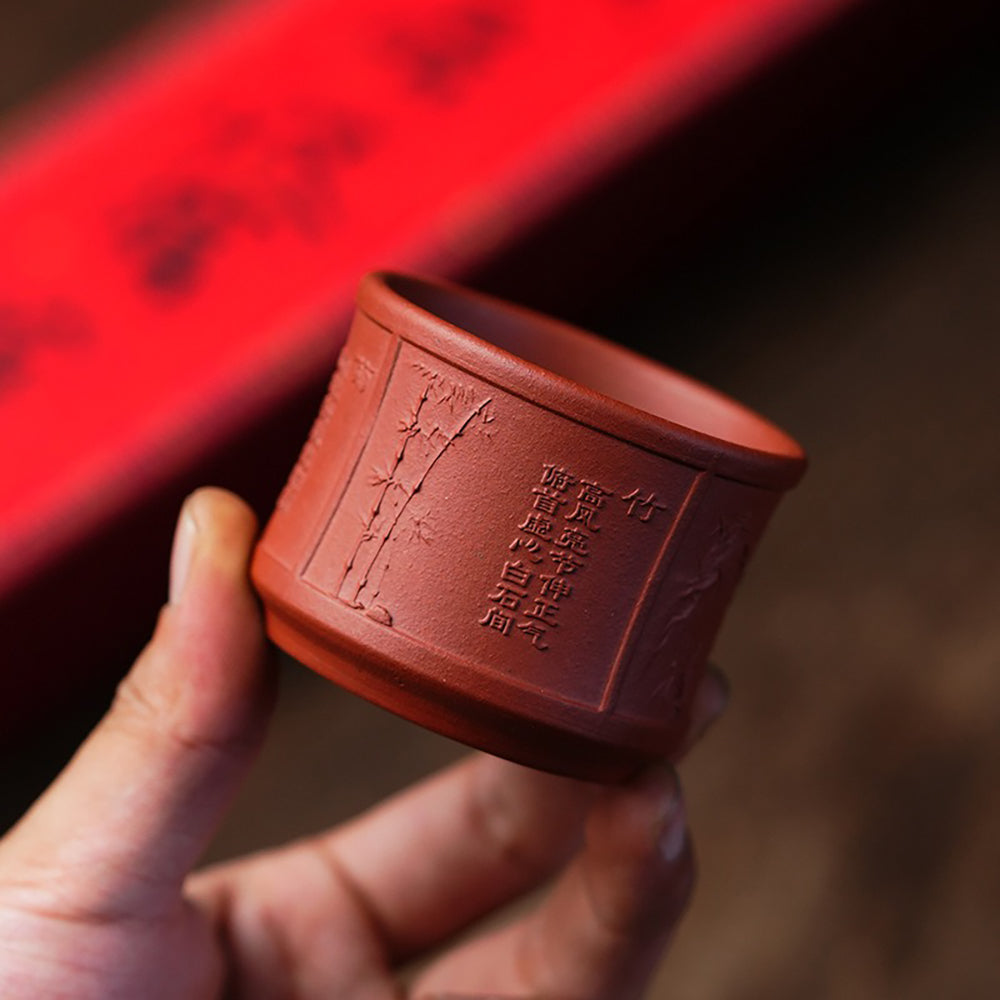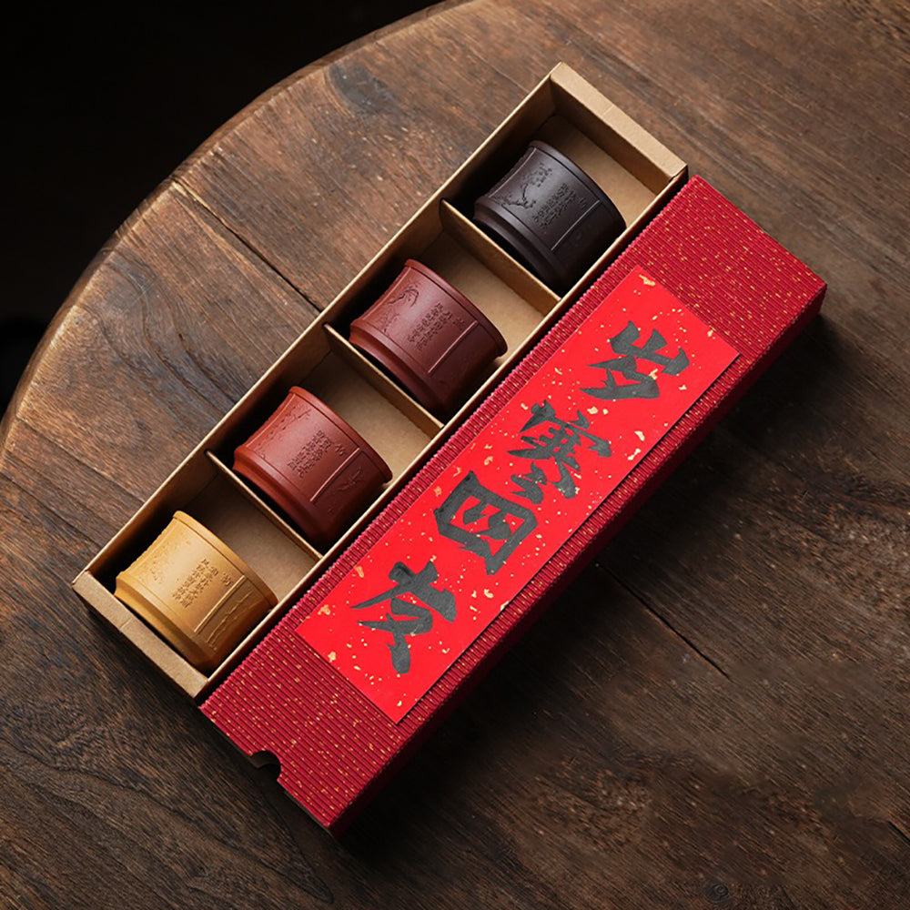 Dieses Teetassen-Set aus violettem Ton besteht aus vier verschiedenen Tonfarben. Bei hohen Temperaturen gebrannt, zeigt die Teetasse eine reiche, erdige Farbe mit einem warmen und natürlichen Ton. Jede Teetasse ist mit Mustern von Pflaumenblüten, Orchideen, Bambus, Chrysanthemen und alten Gedichten graviert. In der traditionellen chinesischen Kultur sind Pflaumenblüte, Orchidee, Bambus und Chrysantheme als die „Vier Freunde des Winters“ bekannt, die im kalten Winter blühen und Widerstandsfähigkeit, Eleganz und Reinheit symbolisieren. Dieses Konzept in Teegeräte zu integrieren, verleiht dem Teegenuss eine rituelle Bedeutung, sodass Menschen die Schönheit der traditionellen chinesischen Kultur erleben können, während sie ihre Tassen heben.