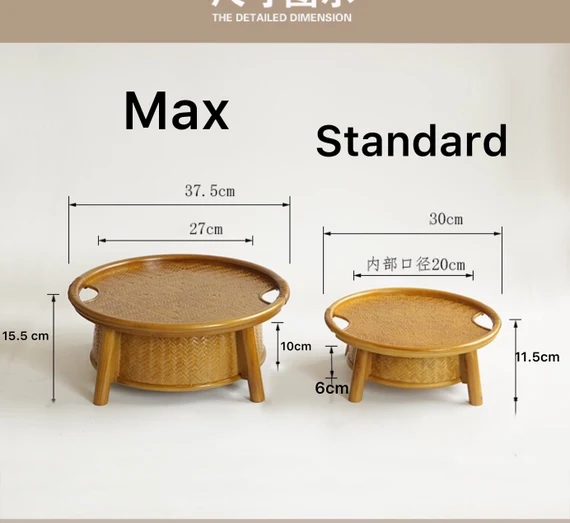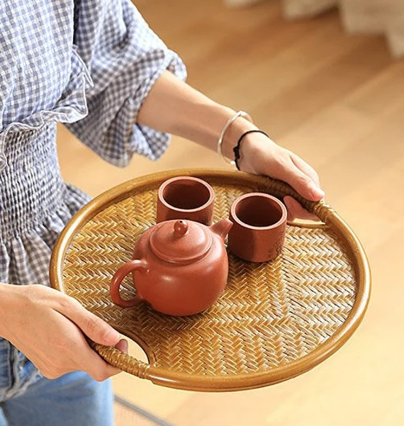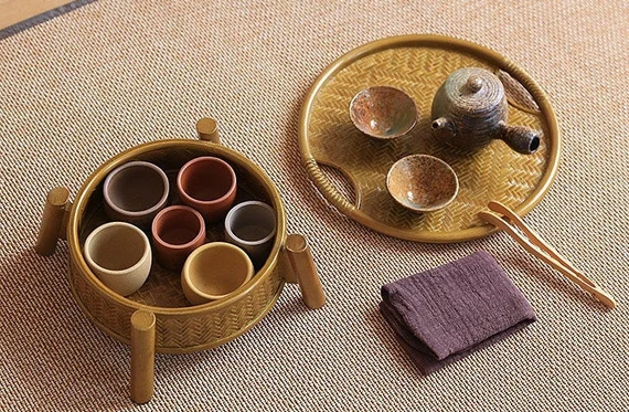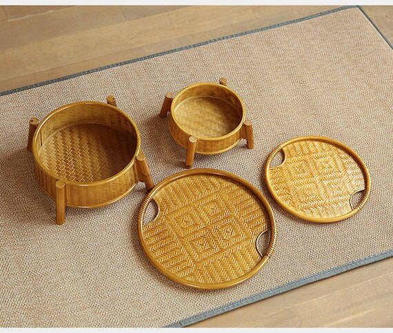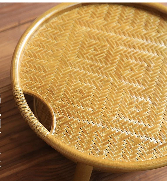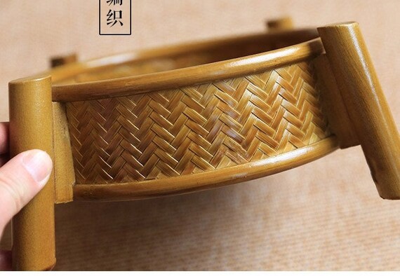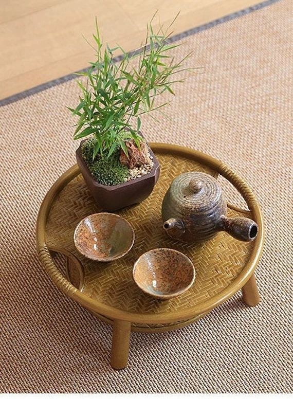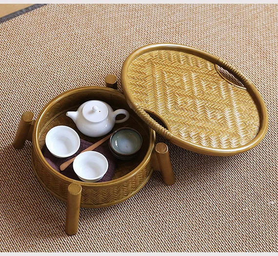 Table de Rangement à Thé Dorée Chinoise Artisanale en Bambou Naturel Tressé Œuvre d'Art Table à Thé Déco Maison Zen Style Chinois