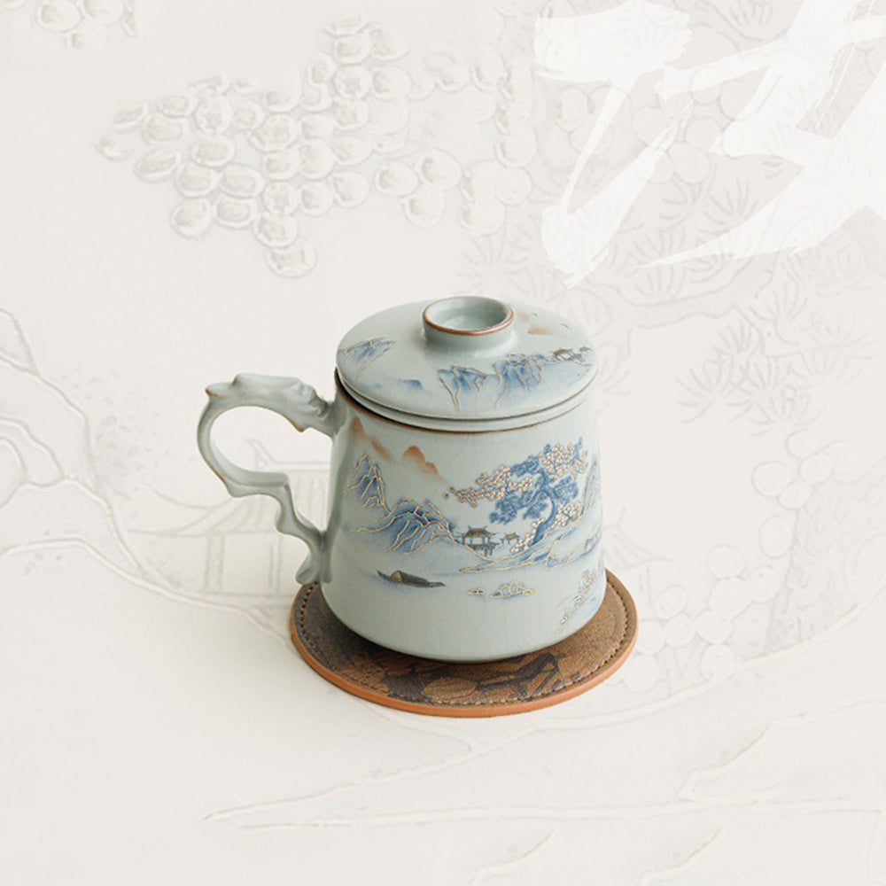 体验古代卓越工艺的魅力,尽在我们的汝窑瓷茶杯。这款百年瓷器美丽典雅,工艺精湛,如同一颗明珠,闪耀着耀眼的光辉。汝窑独特的粉青釉色细腻温润,瓷面带有淡淡的开片纹理,质感自然,呈现出蝉翼纹。茶杯上的宁静山水画与镀金线条勾勒出连绵群山,展现中国传统之美与返璞归真的理念,营造出优雅诗意的东方美学氛围。
